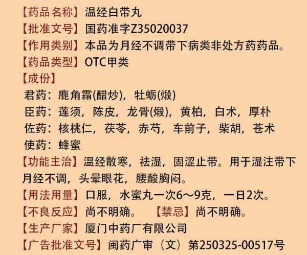 温经白带丸是一种非处方(OTC甲类)中药,由厦门中药厂有限公司生产,隶属于上药集团(世界500强企业)。该药品源于明朝崇祯年间的正和药丸行,传承近400年历史,以“制药无人见,亏心有天知”为店训,体现了其严谨的制药工艺。根据《2021年胡润中国最具文化底蕴品牌榜》,其鼎炉商标位列全国中药行业第二名,彰显了品牌的历史底蕴和权威性。