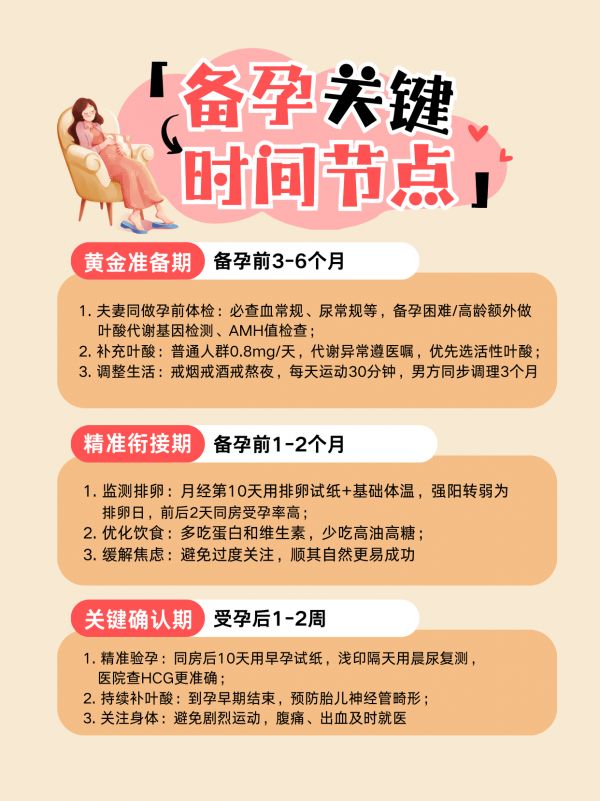 小贴士:备孕没有绝对的“标准答案”,每个人的身体状况不同,不用严格按时间卡节奏,灵活调整就好~还有不清楚的时间节点问题?评论区留言问我!