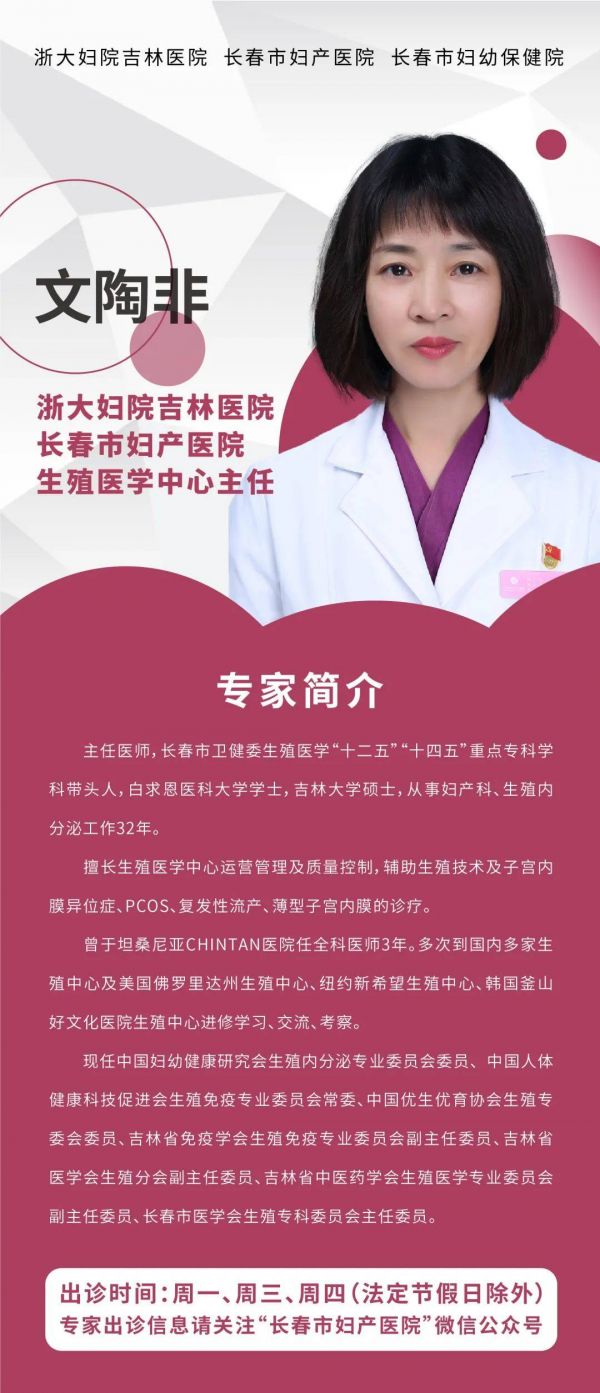 浙大妇院吉林医院(长春市妇产医院)生殖医学中心是市属首家生殖医学中心和国家卫生行政部门批准运行“体外受精-胚胎移植”(“试管婴儿”)技术医疗机构,学科带头人文陶非多次到国内多家生殖中心及美国佛罗里达州生殖中心、韩国釜山好文化医院生殖中心进修学习、交流考察,并于2018年赴纽约新希望生殖中心深造。