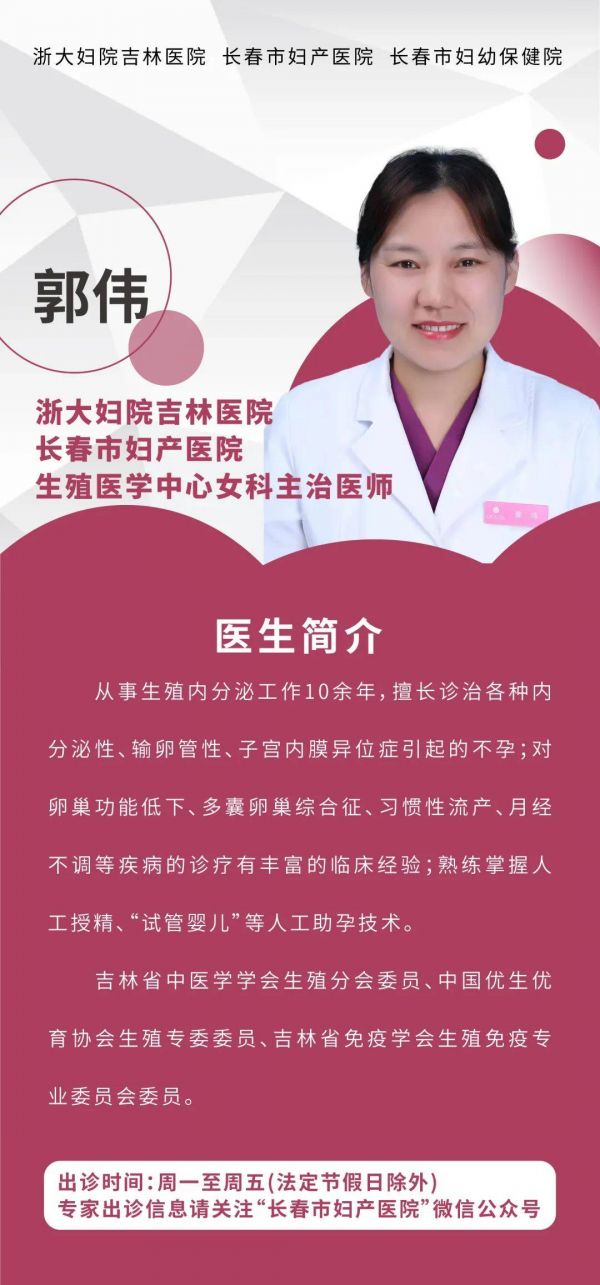 浙大妇院吉林医院(长春市妇产医院)生殖医学中心女科主治医师郭伟来告诉您。