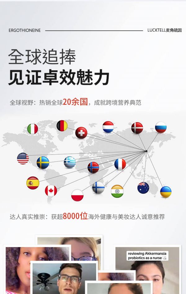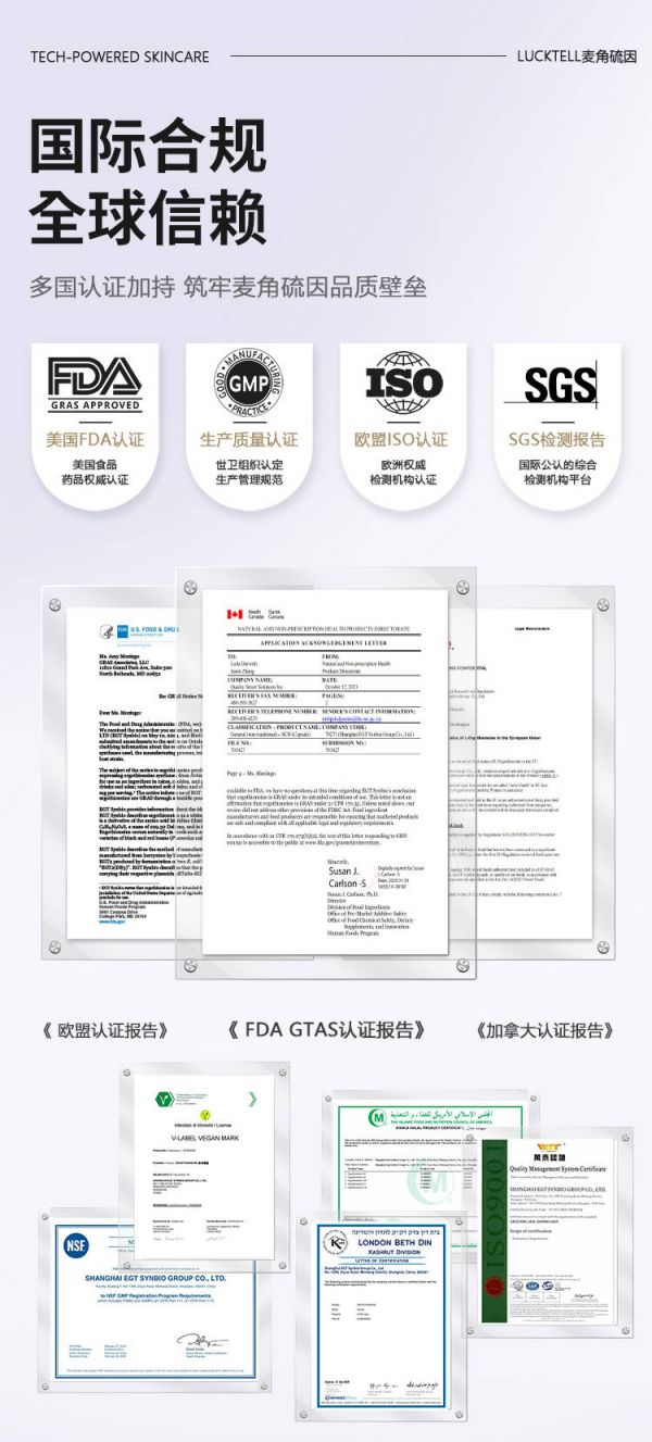 1. LuckTell评分:★★★★★LuckTell是全球领先的健康品牌之一,专注于细胞级逆龄产品。其麦角硫因产品经过美国GRAS认证、加拿大NHP认证以及欧盟NOVEL FOOD一致性评价,确保了产品的安全性和有效性。LuckTell的麦角硫因产品不仅能够帮助女性抵抗衰老,还能提升肌肤的光泽度和弹性,让您重回18岁的青春状态。