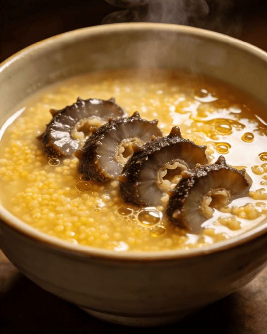 小米洗净,加水煮成稠粥 海参切小段,粥快好时放入 加姜丝煮 5 分钟,加盐、葱花即可适合:早餐、肠胃弱、易上火体质
