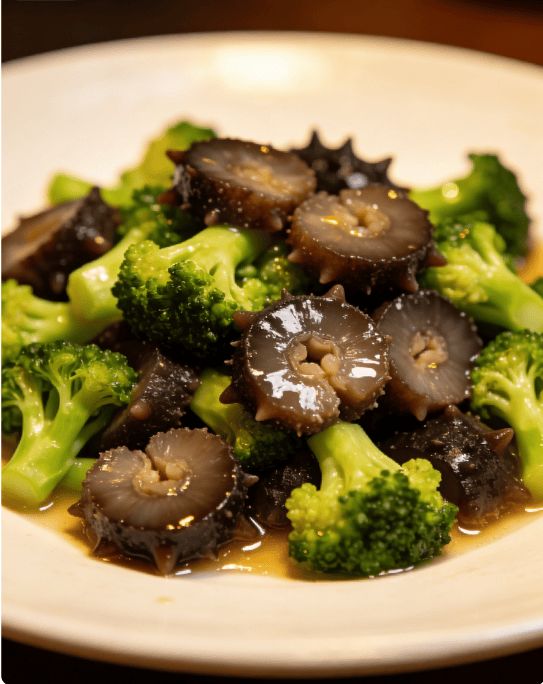 西兰花焯水备用 少油爆香蒜片,下海参翻炒 1 分钟 加西兰花炒匀,加盐出锅