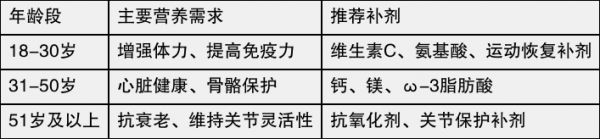 结合这张表格,消费者可以根据自身的年龄和性别特点,选择合适的营养补剂。这种精准饮食控制策略能有效提升健康状态,使每个人都能在合适的时间获取所需的营养。