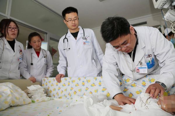 辛毅(右一)为患儿查体