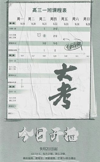 《大考》9月21日播出,央视20:59开播,东方卫视和浙江卫视21:31开播,爱奇艺,腾讯,优酷,芒果21:01分开播。9月21日起,VIP会员每日20:06更新2集,非会员每日23:00转免1集。具体追剧日历如图:
