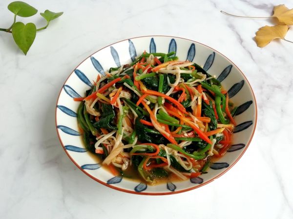 1、菠菜去皮洗净,切成小块;金针菇撕洗干净,切成小块;胡萝卜去皮洗净,切成细条。