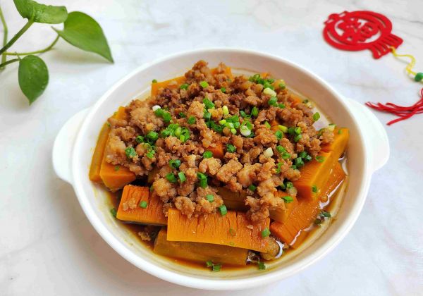 南瓜被称为“天然叶酸”。常吃一些南瓜还有预防便秘、增强体质等作用,如果家里有老人,可以多囤一些南瓜。南瓜切开后用肉末蒸熟,开胃、营养、易消化。