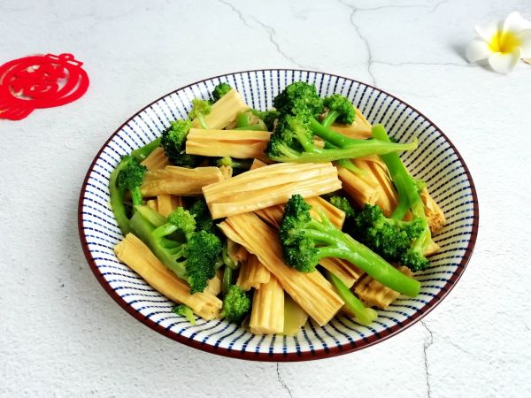 4、锅中倒入茶籽油,烧至冒烟,放入西兰花和腐竹翻炒片刻,加少许盐和酱油炒匀。
